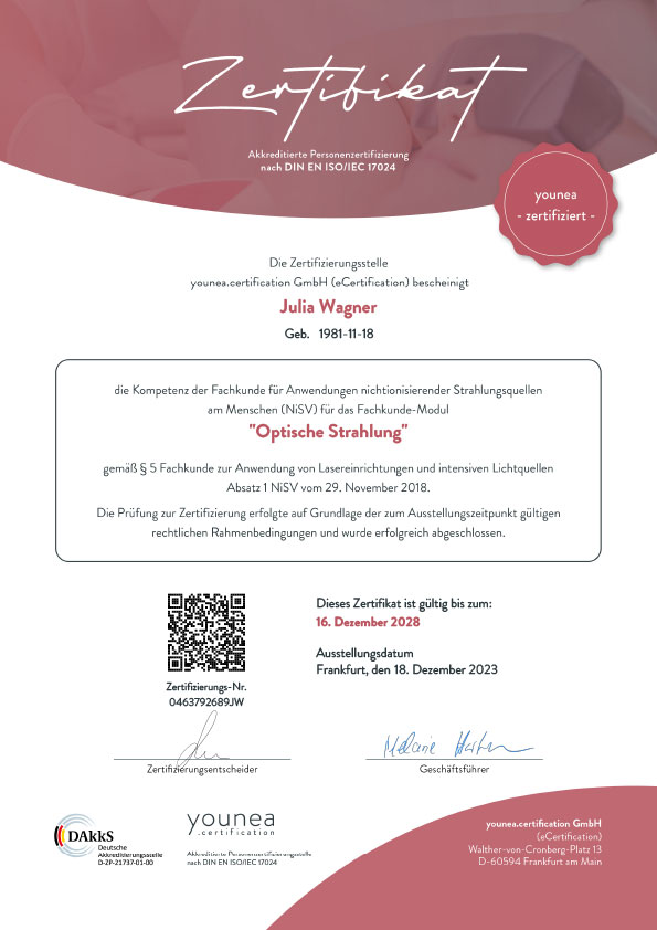 Unser Studio und unsere Fachkräfte sind NiSV-zertifiziert und erfüllen alle gesetzlichen Anforderungen. Alle Behandlungen erfolgen durch eine geprüfte Spezialistin mit offiziellem Fachkundenachweis – mit zertifizierten Geräten und höchsten Standards in Qualität, Hygiene und Sicherheit.